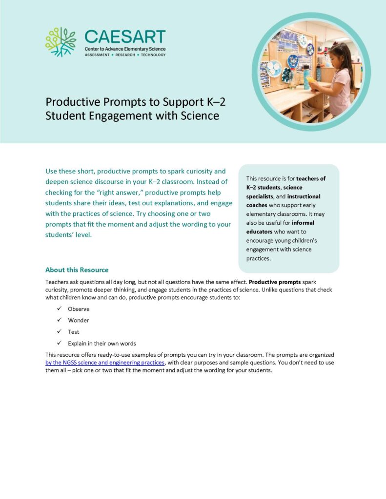 Bring science talk to life with prompts designed for K–2 explorations of motion, stability, and other physical science concepts. This resource offers examples of how to use productive prompts during […]